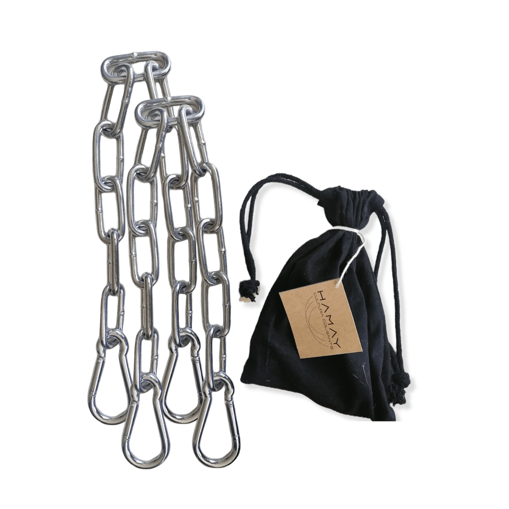 El kit para hamaca incluye 2 cadenas de 55 cm (de 8 mm, zincado brillante) y 4 mosquetones (de 10 mm, zincado brillante).