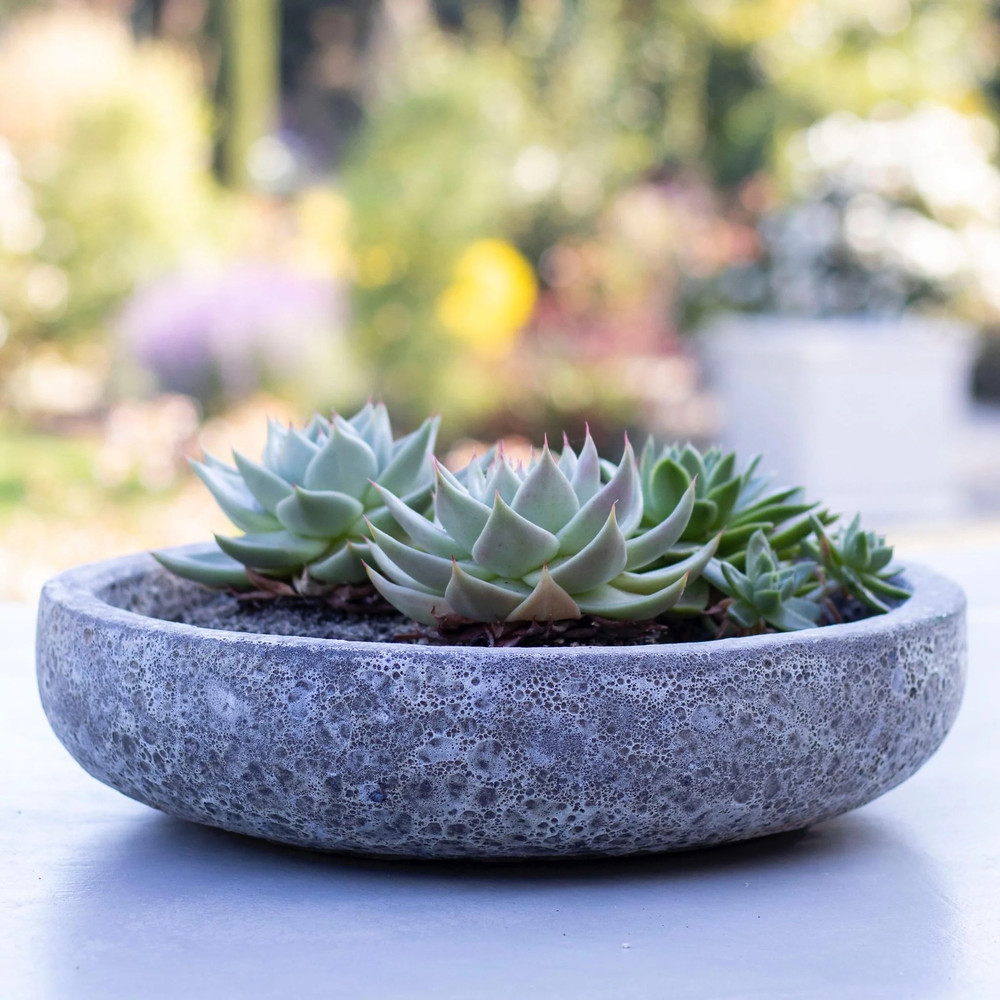 Este macetero de diseño bajo y elegante es ideal para crear arreglos de suculentas que se conviertan en atractivos centros de mesa. Su singularidad lo convierte en el favorito para un regalo único y memorable, perfecto para sorprender a alguien especial con un detalle lleno de carácter. También se puede pedir sin drenaje, para usarlo como espejo de agua.
