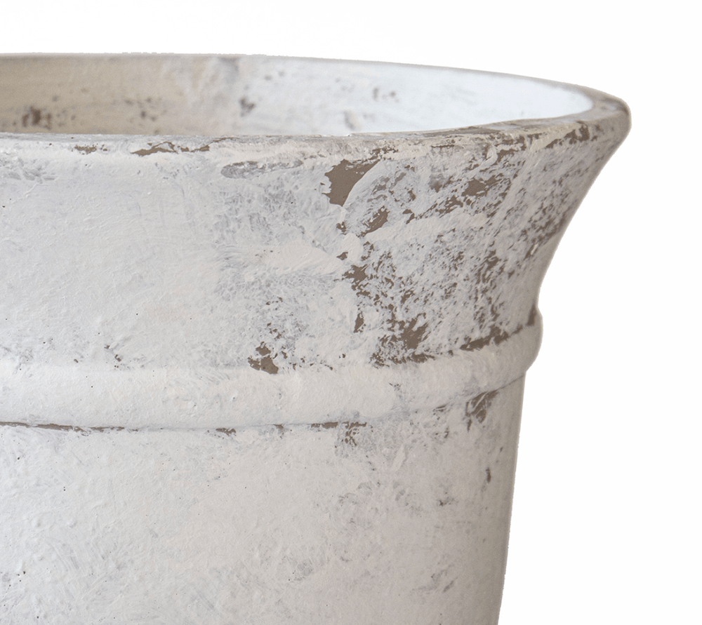 El modelo Melí cuenta con un estilo clásico-vintage, en color blanco albayalde y toques desgastados que le dan un aspecto envejecido. Este macetero es ideal para espacios exteriores, adaptándose increíblemente bien a todo tipo de jardines o terrazas.