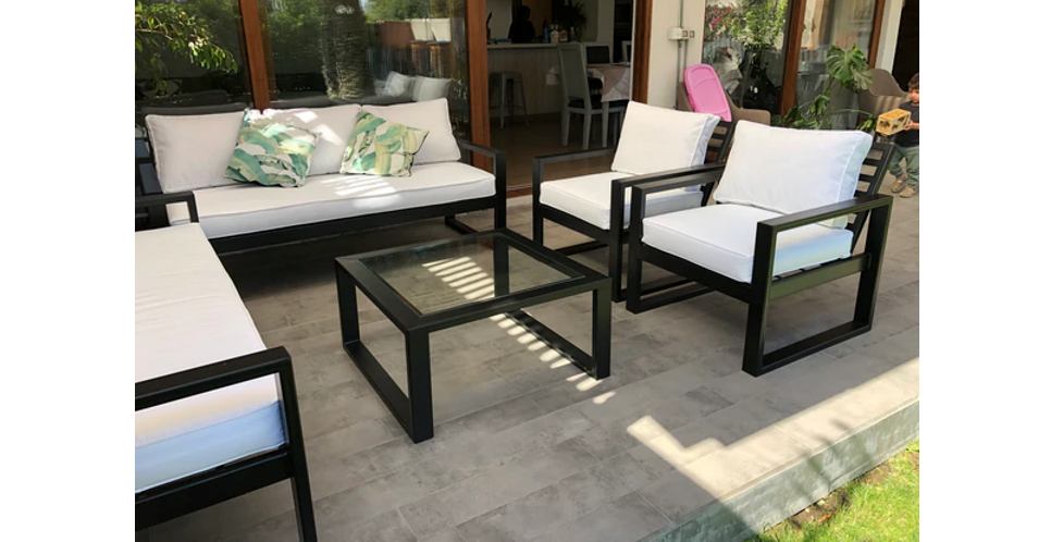 Mesa de centro muy versátil y liviana visualmente, que sirve tanto para interior como para exterior. La estructura es de fierro de perfil rectangular electropintado negro (o en otro color a elección) y tiene un vidrio de 8 o 10 mm en la cubierta.