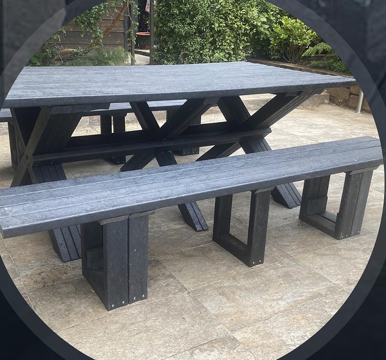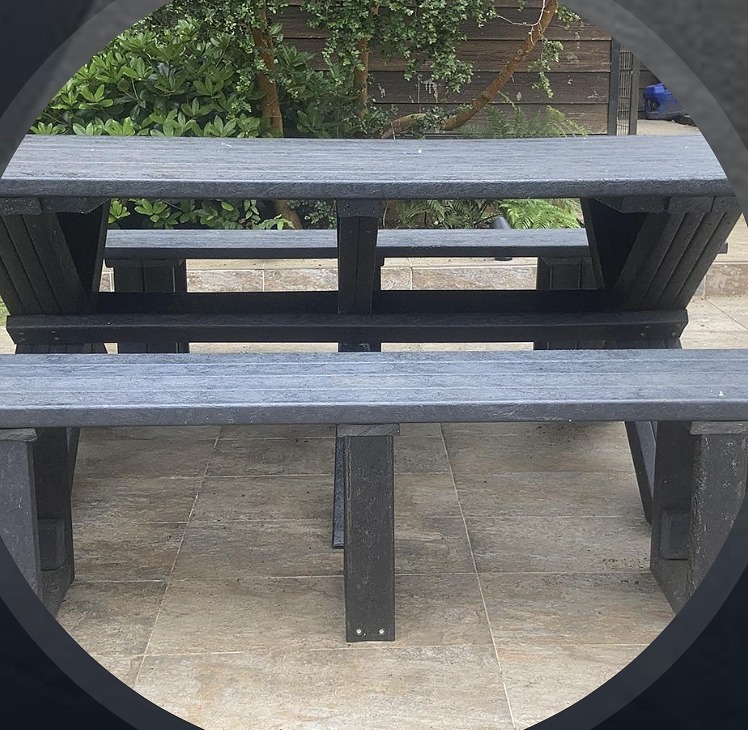 Este mueble es fabricado por EcoMaderas Río Verde, una empresa valdiviana con más de 12 años de experiencia en reciclaje y fabricación de maderas plásticas. La ecomadera o ecotabla es un producto creado a partir de plástico 100% reciclado, recuperado de desechos domiciliarios e industriales de la Región de Los Ríos. Es un material que presenta una gran resistencia estructural, superior a la madera. No se deforma, no se tuerce, no se agrieta ni se astilla, por lo que es ideal para los muebles y accesorios de las terrazas sin techo y lugares al aire libre en general.