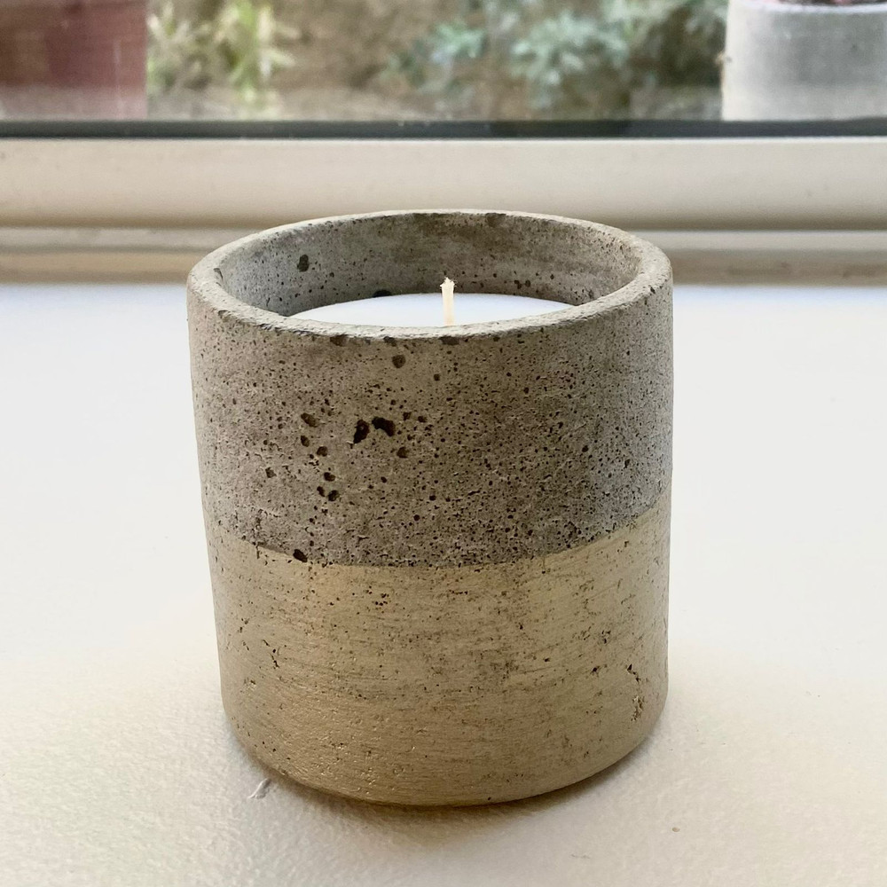 Vela de parafina con suave aroma a vainilla que viene en un elegante recipiente de cemento pulido de 8 cm de diámetro por 8 cm de altura. Puedes optar entre el diseño liso o con la mitad pintada de oro, plata o cobre.