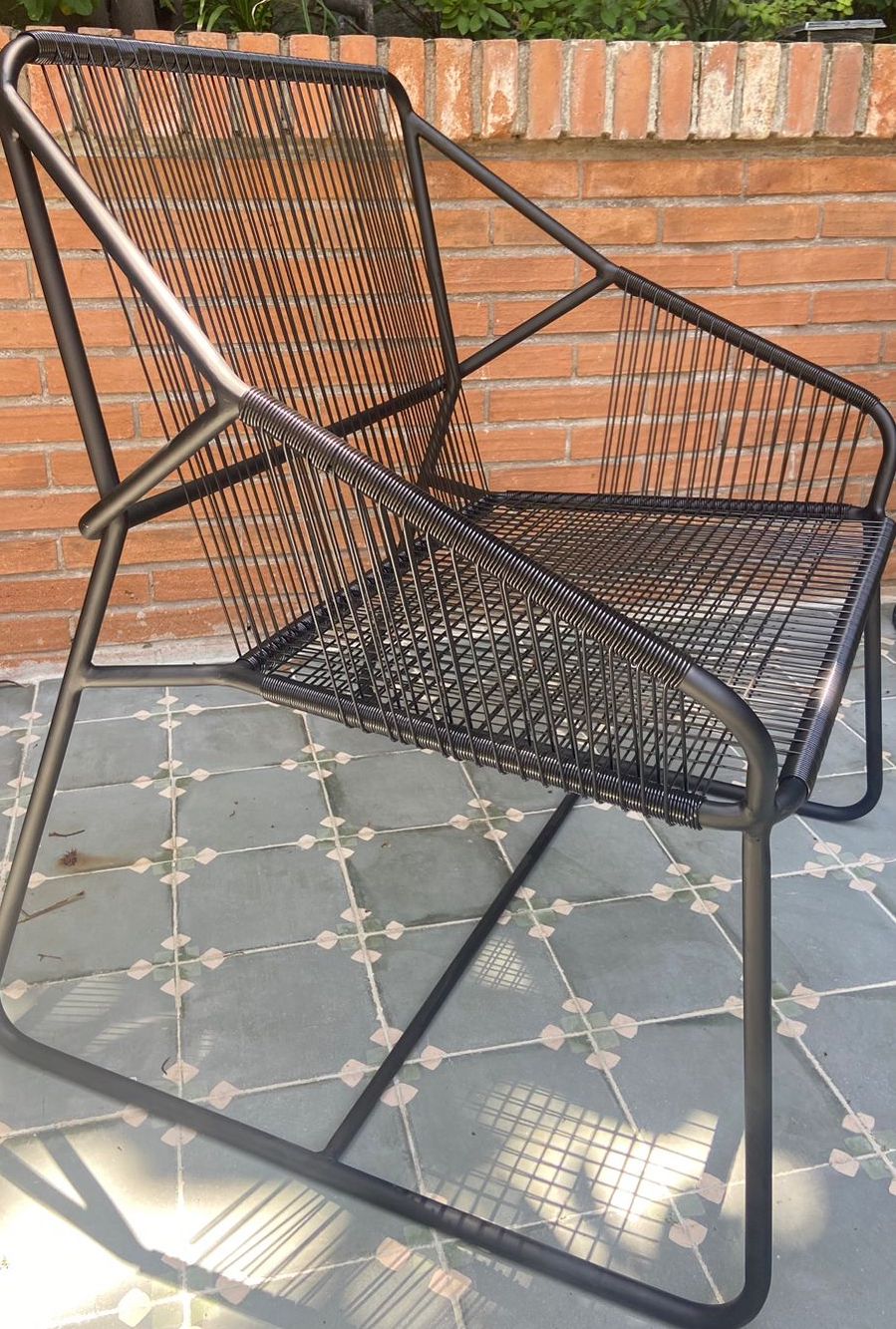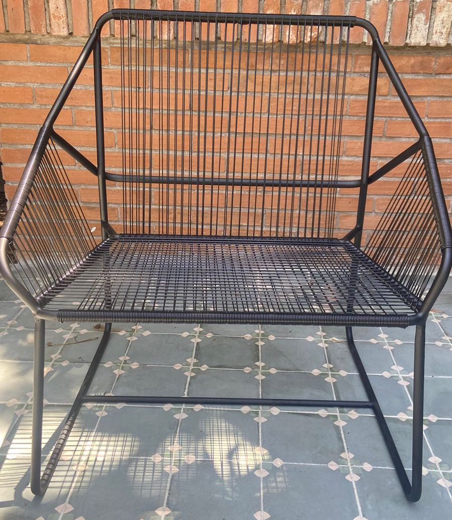 Cada pieza es única. La estructura es de fierro sólido electropintado negro o blanco (la pintura es anticorrosiva y antibacterial) y el asiento y respaldo están conformados por un tejido con cuerda de PVC con protección UV. Por lo tanto, es el sitial perfecto para tu terraza (y para cualquier lugar de tu casa en realidad).